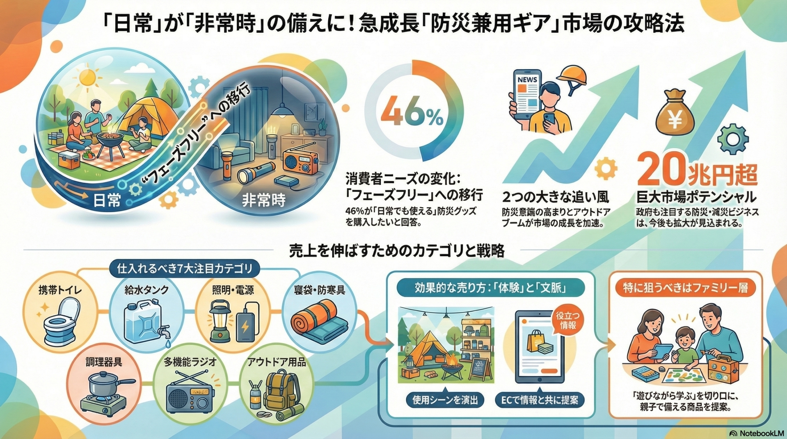 防災兼用ギア市場は、災害多発とアウトドアブームという2つの追い風を受け、20兆円規模への成長が見込まれる有望市場です。消費者ニーズは「非常時専用」から「フェーズフリー(日常・非常兼用)」へシフトしており、小売店には新たな商機が訪れています。