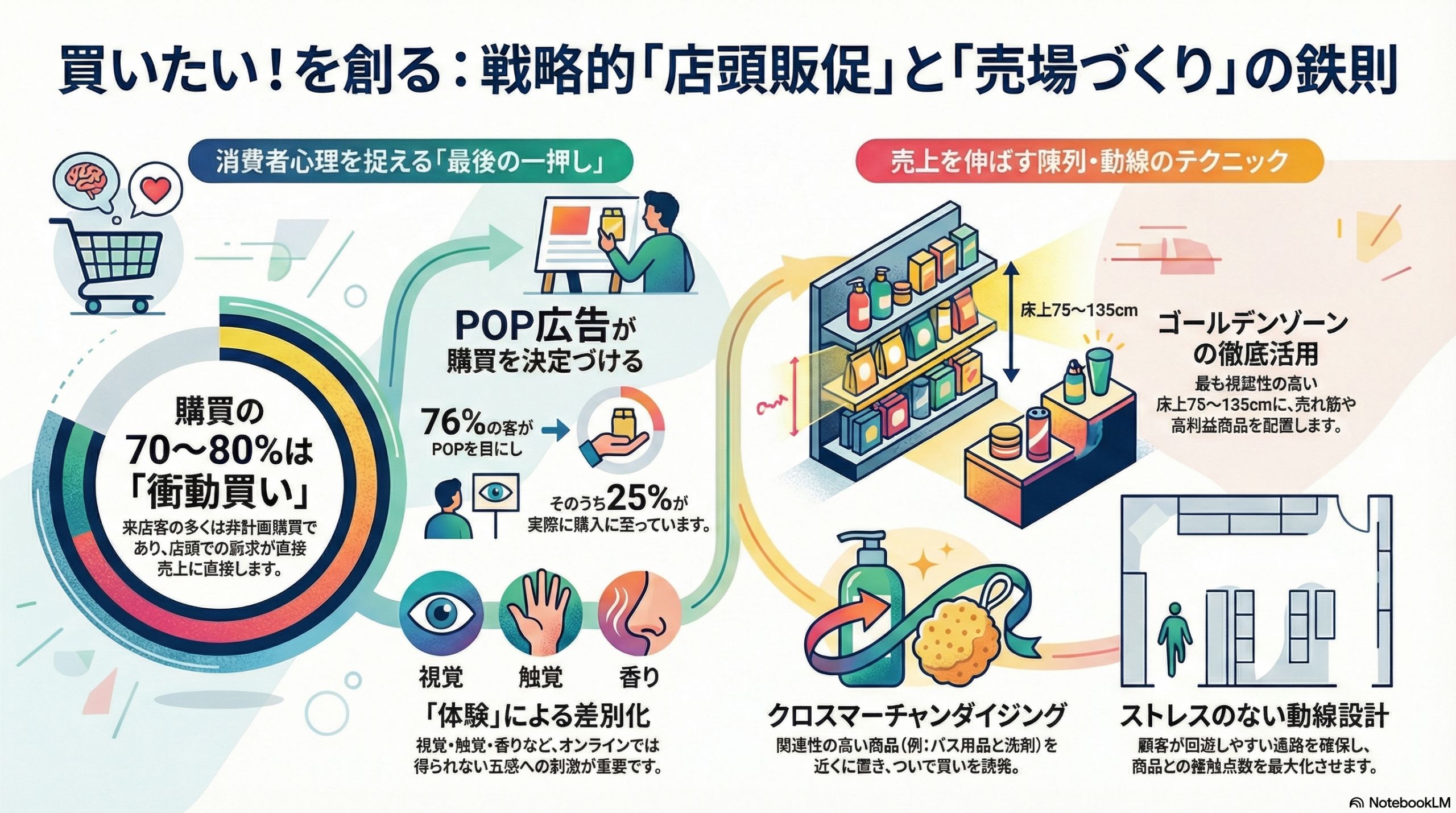 消費者の購買行動では、衝動買いの割合が依然高いことが知られています。ある調査では来店客のうち約70~80%が非計画購買で、約76%が店内のPOP広告を目にしており、POP効果で購入した人は25%に達します。