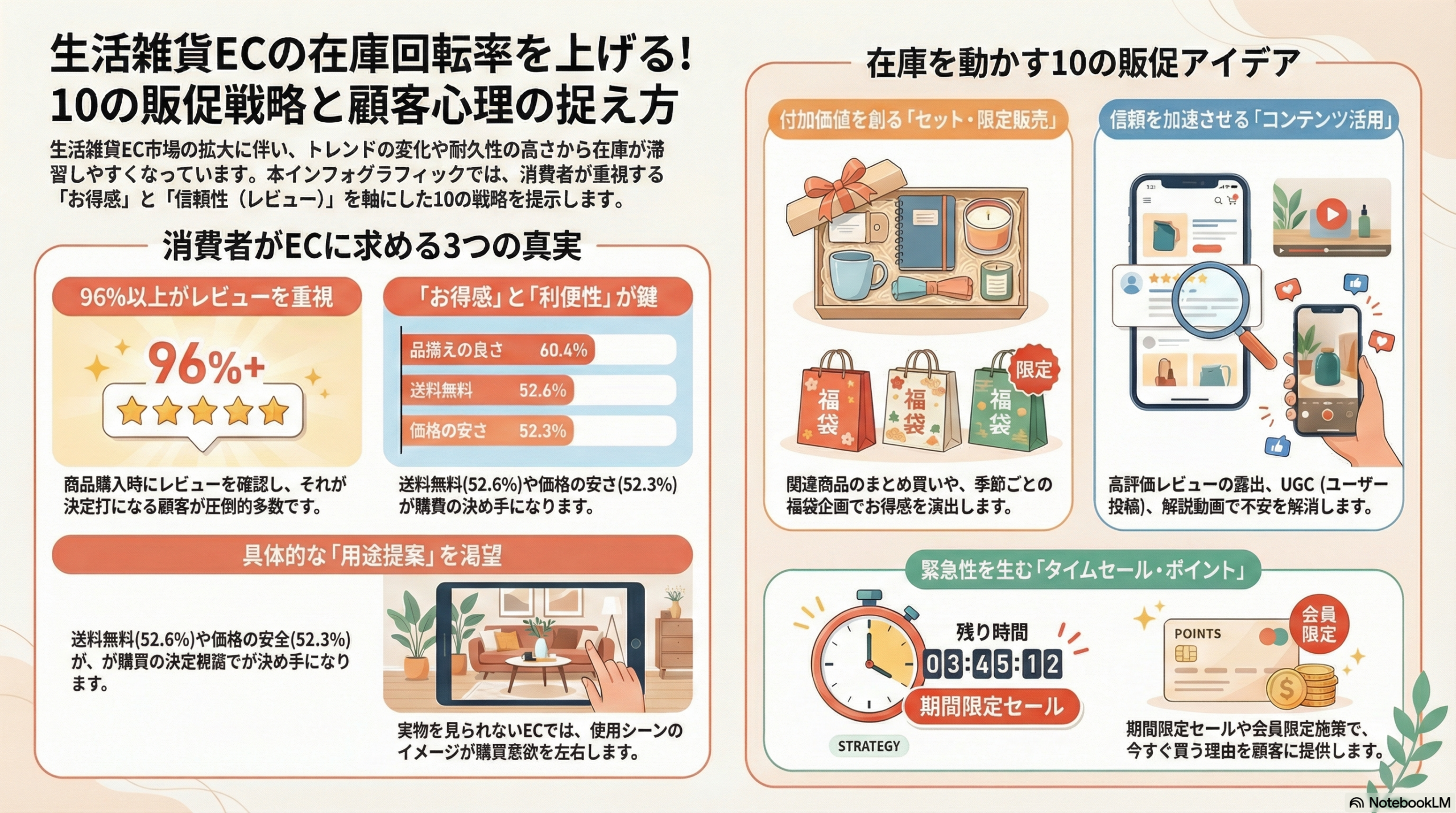消費者は価格・レビュー・利便性を重視する一方で、実物を確認できないECでは商品情報の不一致や魅力不足で購入をためらうケースも多く、売れ残りを避けるには効果的な販促施策が必要です。