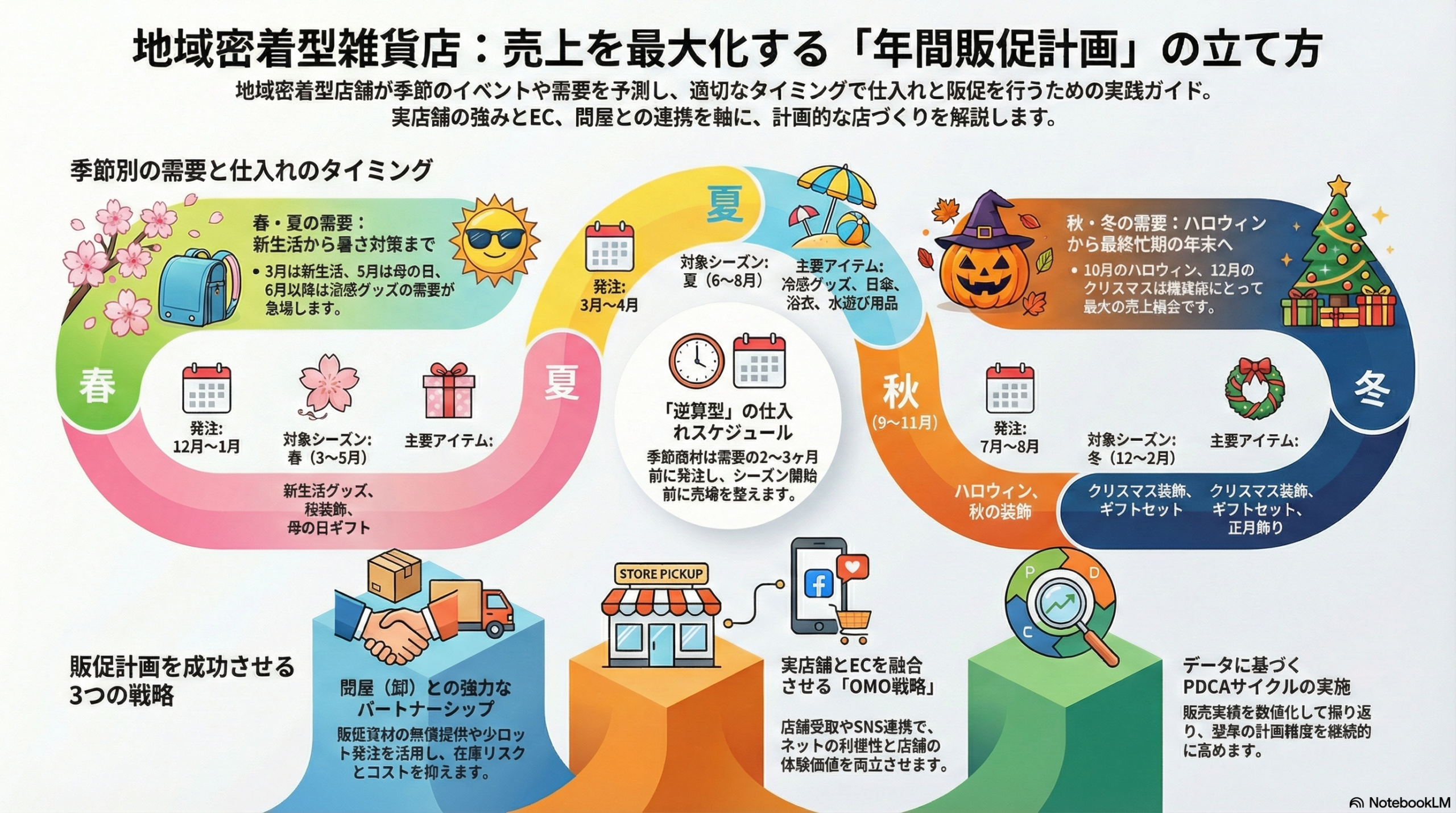 地域密着型雑貨店の年間販促計画は、季節需要の把握、早期の仕入れ計画、EC連携、問屋との協力体制が成功の鍵です。年間イベントリストを作成し、各月ごとに商品展開と販促施策を逆算して計画することで、売上機会を最大化しながら在庫リスクを抑えられます。